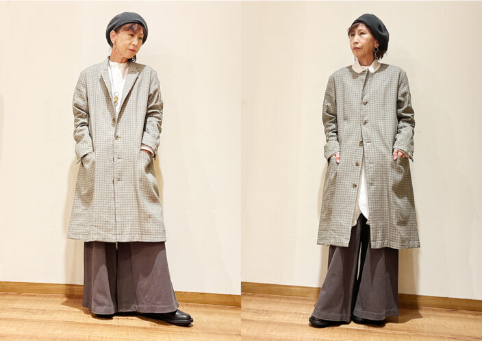 裏地が配色になった襟を立てればステンカラー風のコートに!