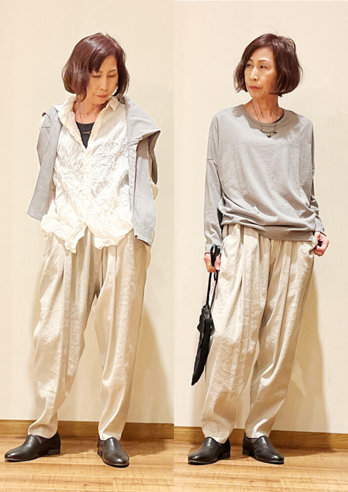 後ろヨークギャザーや脇スリットなどボリューム感を楽しみたいアイテムです。