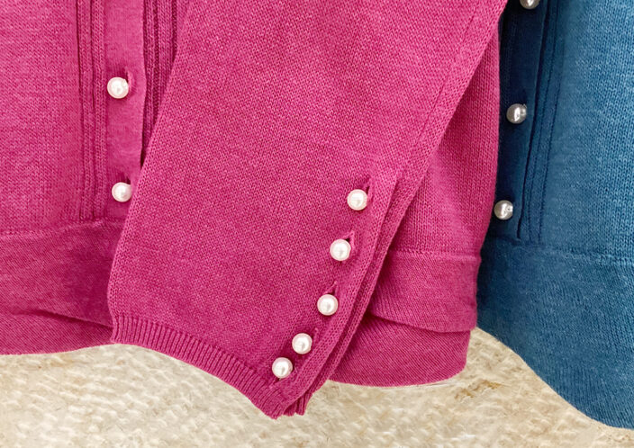 胸元にパールボタンをあしらいボタンの開け閉めで