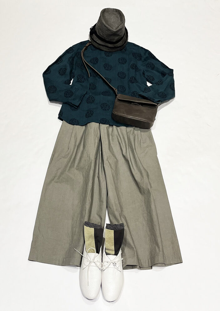 優しいベージュの鹿の子の表情が深みカラーのブラウスを