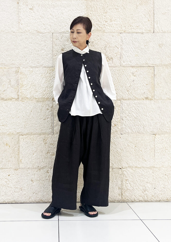 ゆったりとしたサルエルデザインのリネンパンツです。